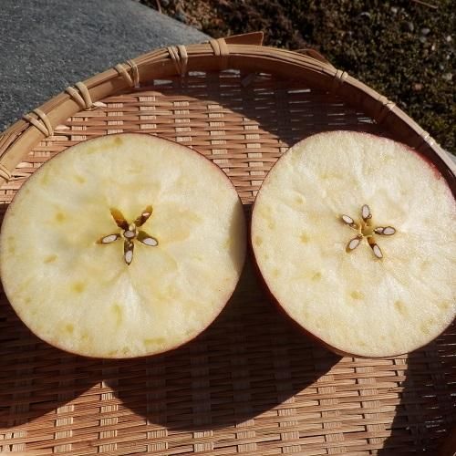 ダークな見た目とは裏腹に、果汁が多く、実はかためで、シャキッとした歯ざわり、甘味と酸味のバランスがほどよく、濃厚でりんごらしい味わいです。